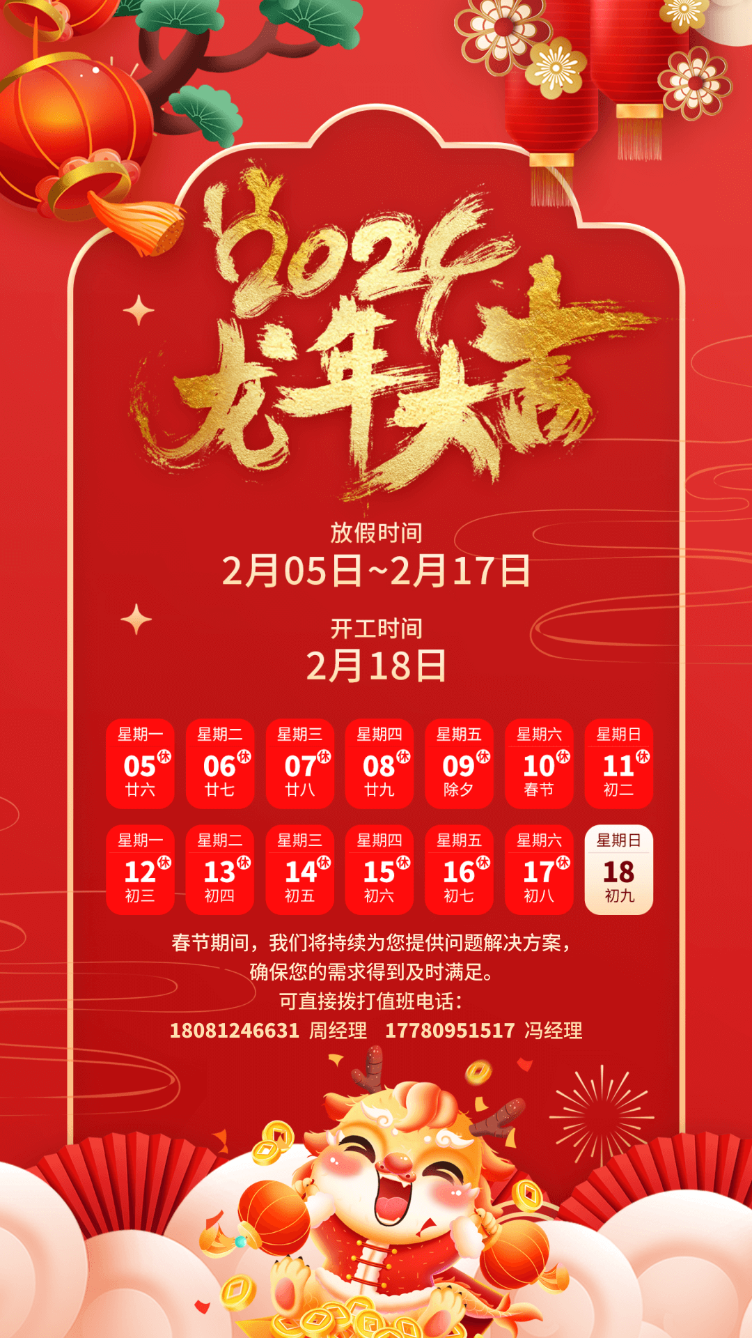 2024年新春佳節(jié)將至,根據(jù)國家的法定節(jié)假日規(guī)定及結(jié)合本公司實(shí)際情況,現(xiàn)將2024年春節(jié)放假時間作如下安排: