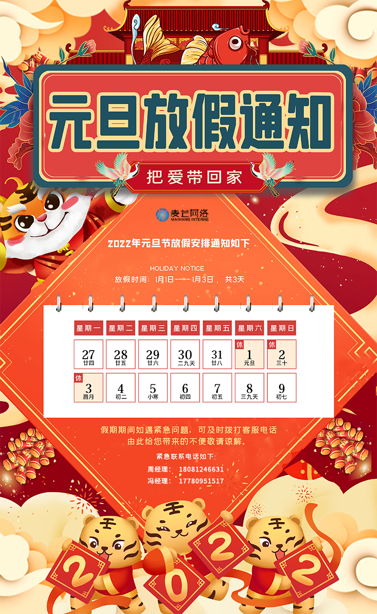 一、放假時(shí)間:2022年1月1日(星期六)至1月3日(星期一)放假,共計(jì)3天;1月4日(星期二)正常上班。